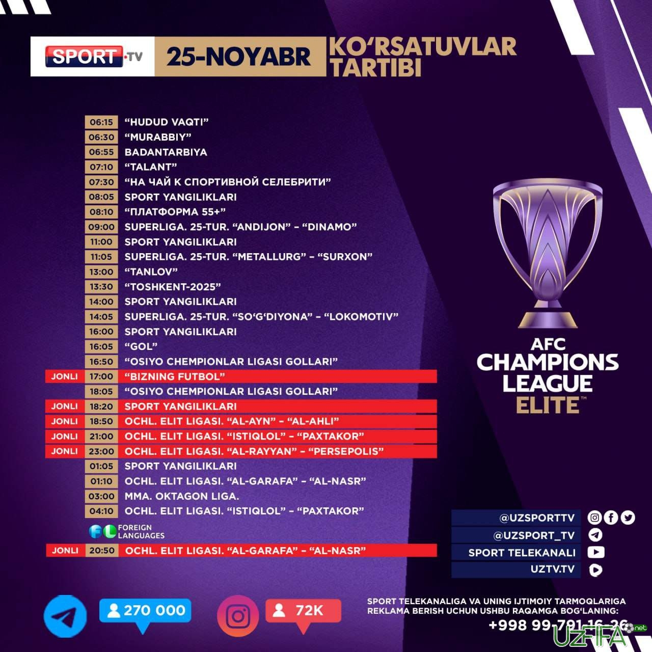 Sport TV'da 25 noyabr kuni Elit OCHLning 4 ta o‘yini jonli translyasiya qilinadi