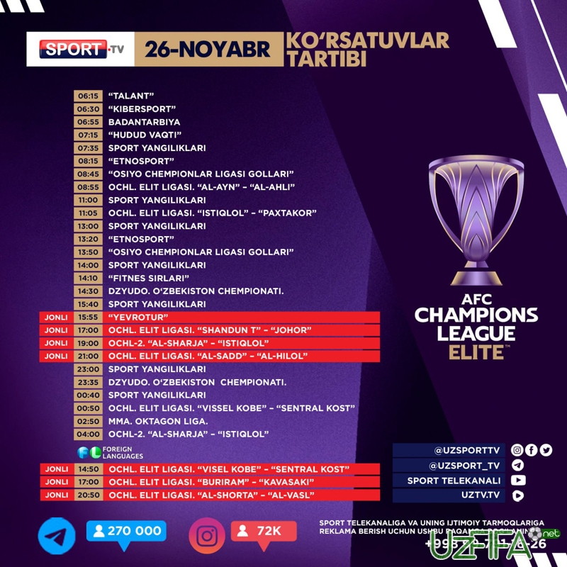 Sport TV'da 26 noyabr kuni Elit OCHLning 6 ta o‘yini jonli translyasiya qilinadi