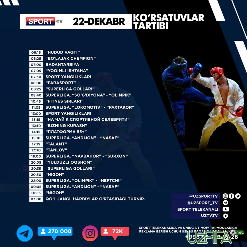Sport telekanali 22-dekabr kungi ko‘rsatuvlar dasturi