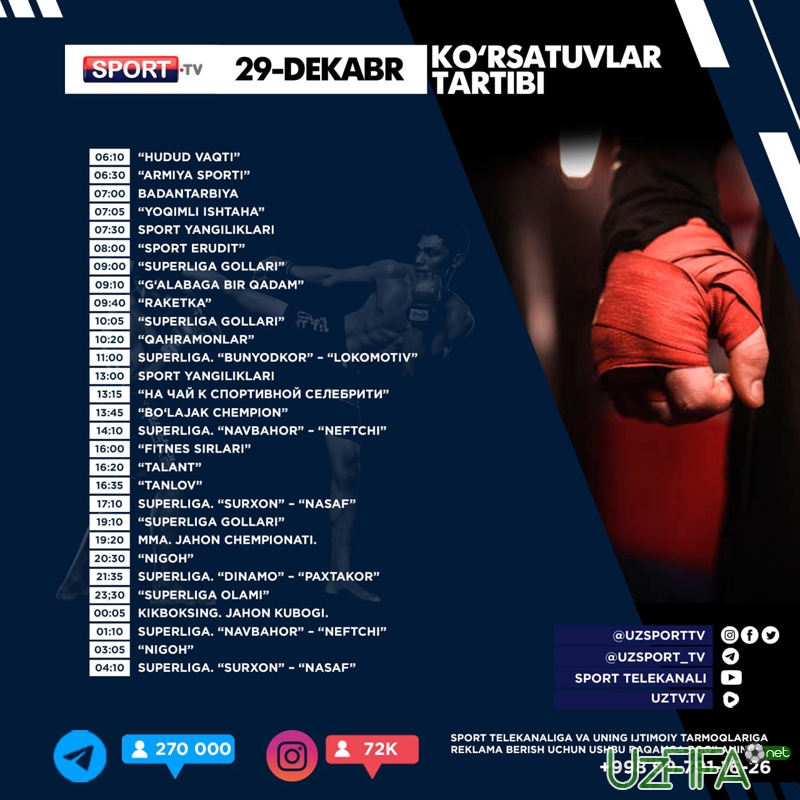 Sport telekanali 29-dekabr kungi ko‘rsatuvlar dasturi