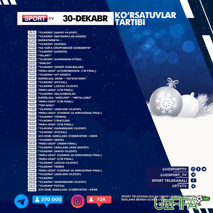 Sport telekanali 30-dekabr kungi ko‘rsatuvlar dasturi