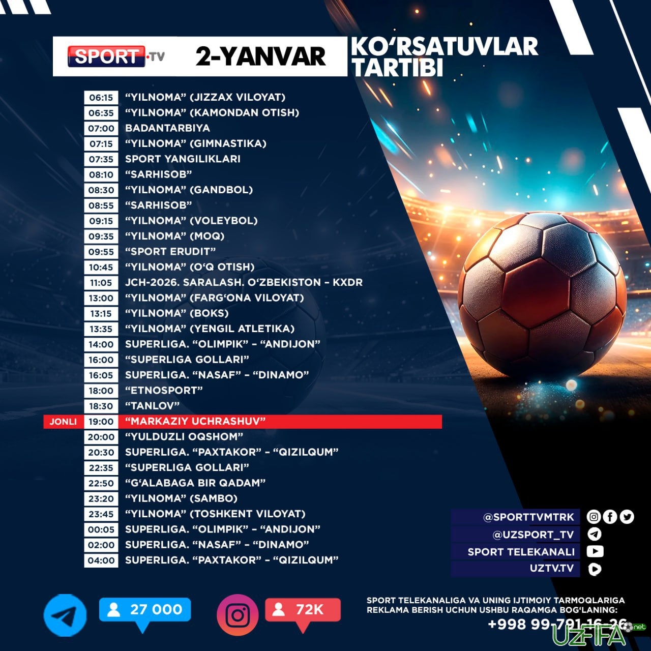 Sport TV telekanali 2 yanvar kungi ko‘rsatuvlar jadvali