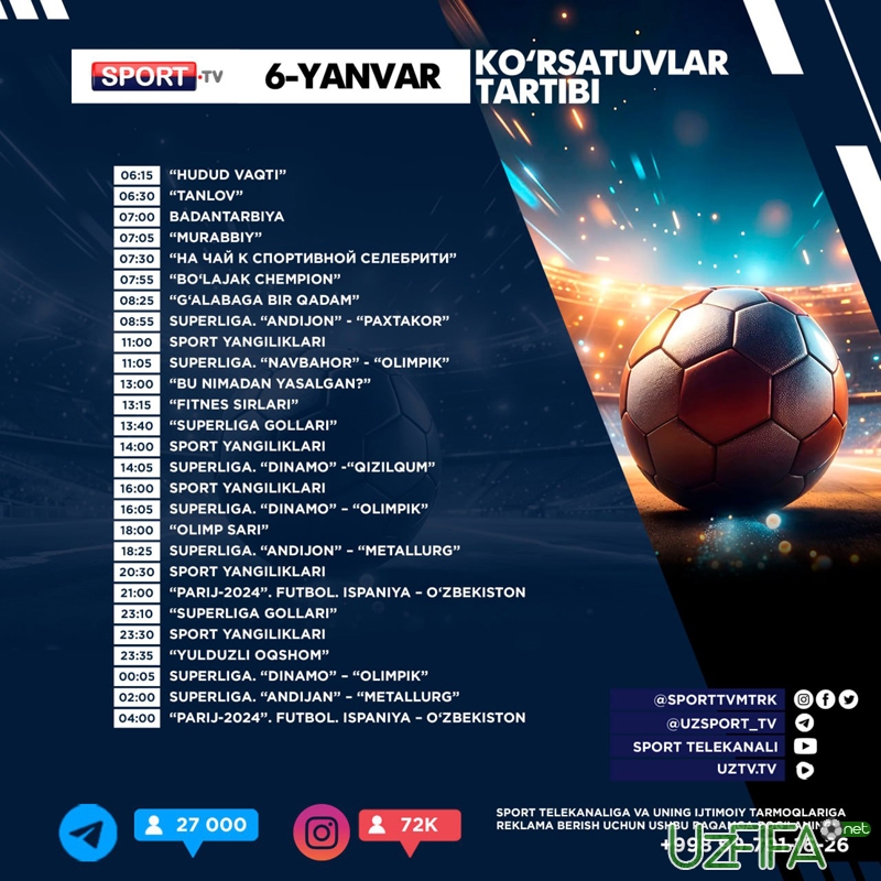 Sport telekanali 6-yanvar kungi ko‘rsatuvlar dasturi