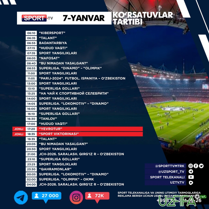 Sport telekanali 7-yanvar kungi ko‘rsatuvlar dasturi