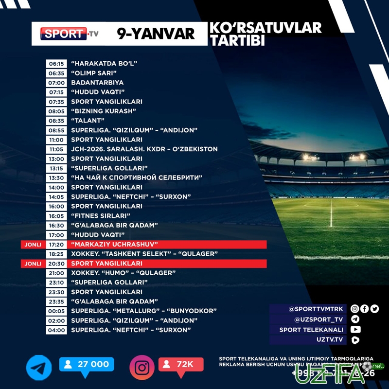 Sport telekanali 9-yanvar kungi ko‘rsatuvlar dasturi