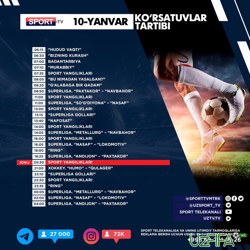Sport telekanali 10-yanvar kungi ko‘rsatuvlar dasturi