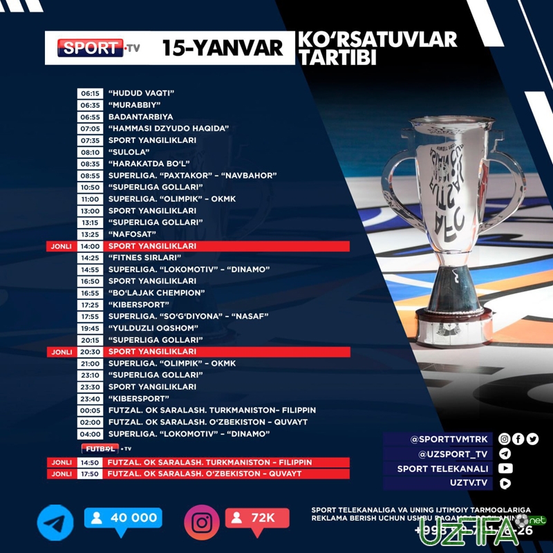Futbol TV telekanalida 15-yanvar 2 ta jonli futzal translyasiyasi bor
