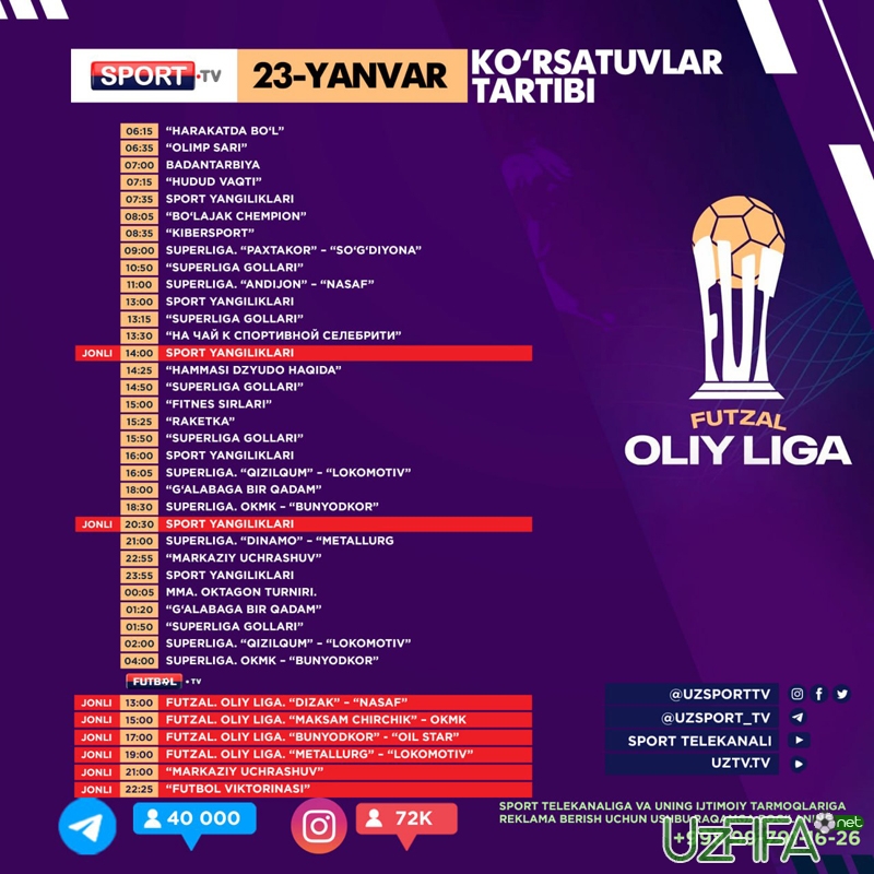 Futbol TV telekanalida 23-yanvar kuni 4 ta jonli futzal translyasiyasi bor