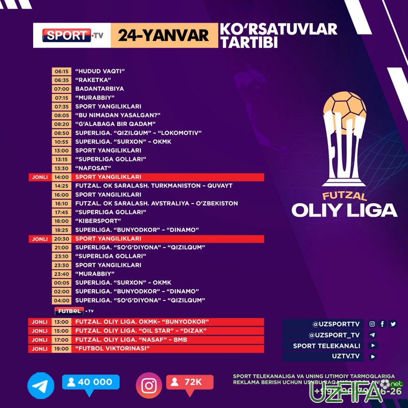 Futbol TV telekanalida 24-yanvar kuni 3 ta jonli futzal translyasiyasi bor