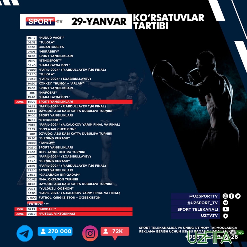 Sport telekanali 29-yanvar kungi ko‘rsatuvlar dasturi