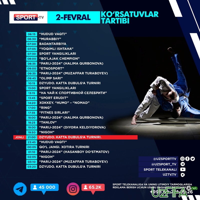 Sport telekanali 2-fevral kungi ko‘rsatuvlar dasturi