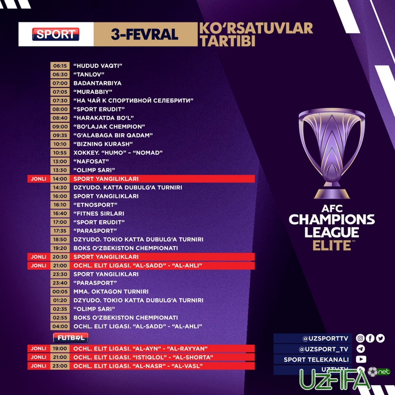 Sport va Futbol telekanallarida 3 fevral kuni OFK Elit chempionlar ligasining 4 ta o‘yini jonli translyasiya qilinadi
