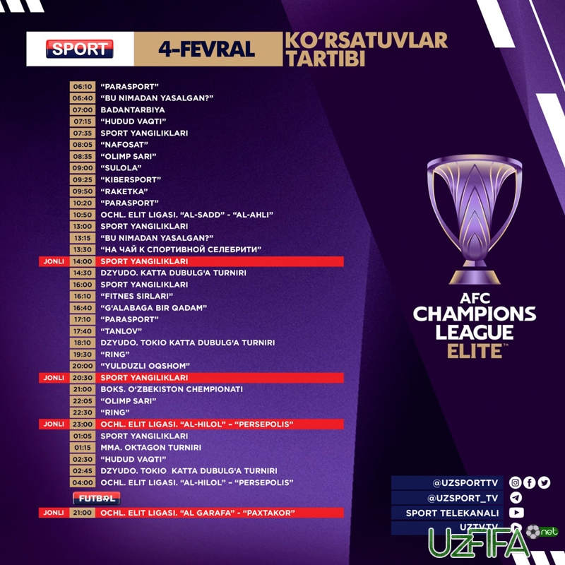Futbol telekanali 4 fevral kuni «Al-G‘arafa» - «Paxtakor» o‘yinini jonli translyasiya qiladi