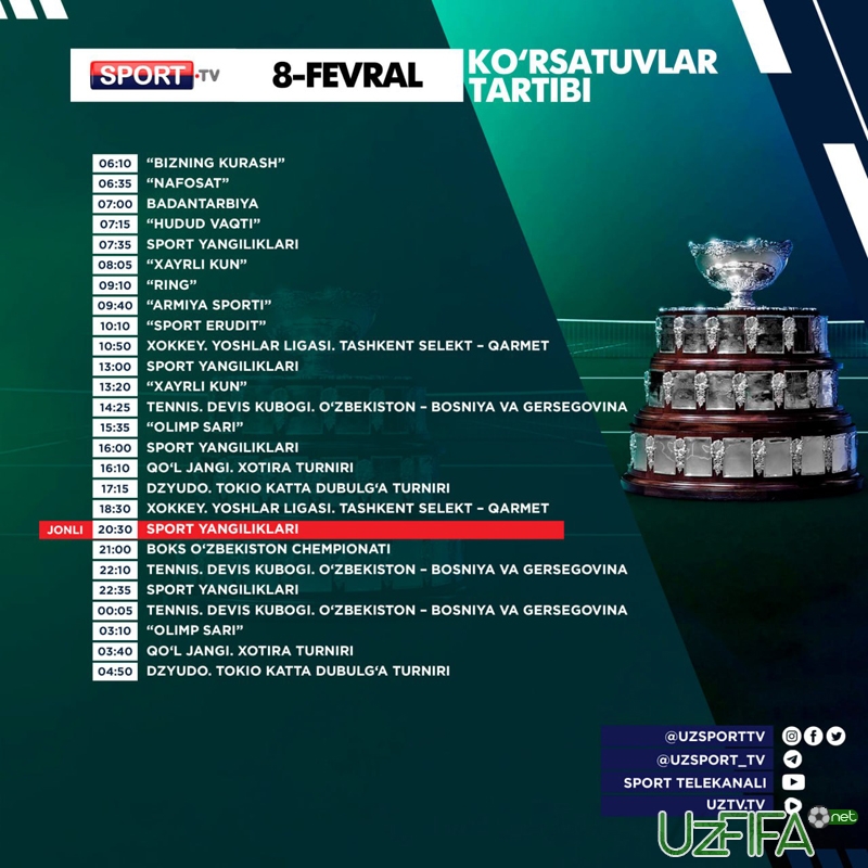 Sport telekanali 8-fevral kungi ko‘rsatuvlar dasturi