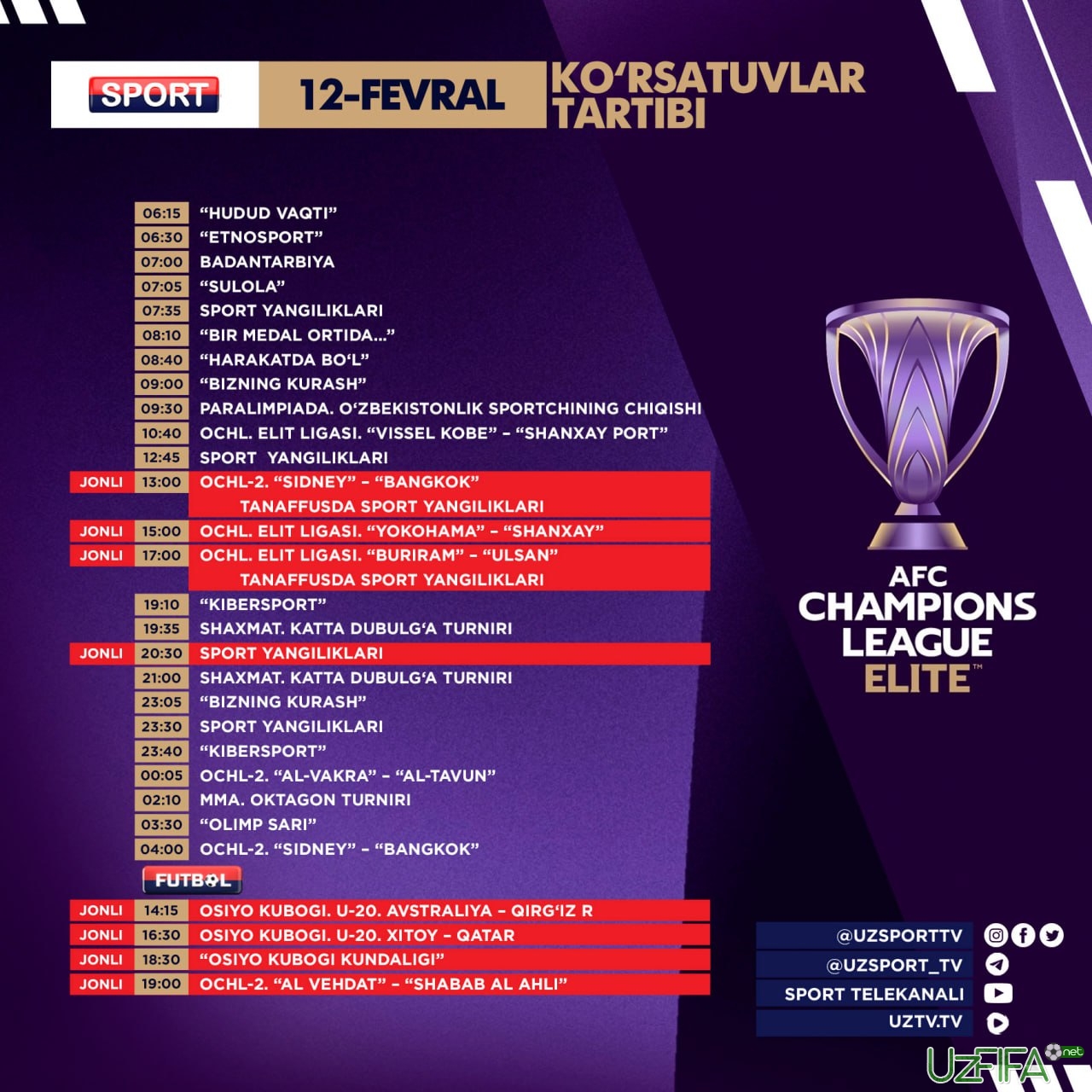 Sport va Futbol telekanallarida 12 fevral kuni 6 ta jonli futbol translyasiyalari bor