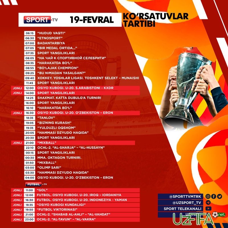 Sport va Futbol telekanallarida 19 fevral kuni 6 ta jonli translyasiyalar bor
