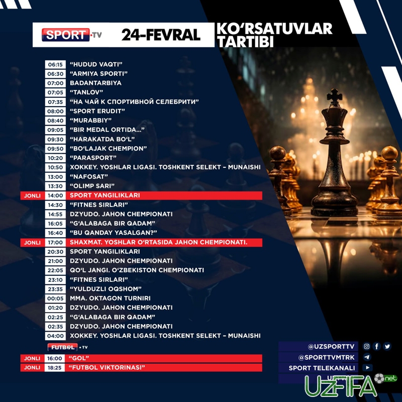 Sport va Futbol telekanallarining 24-fevral kungi ko‘rsatuvlar dasturi