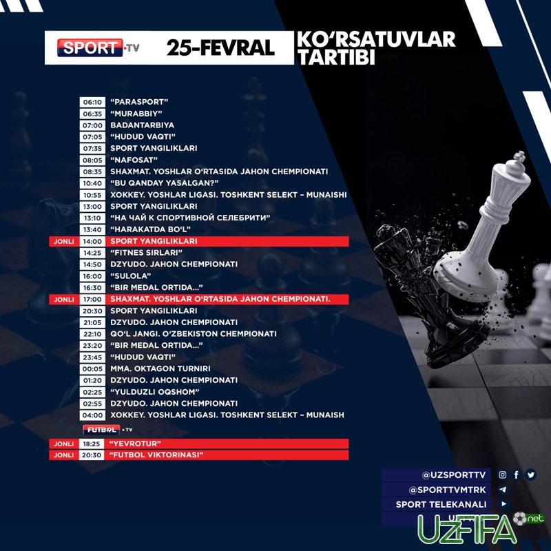 Sport va Futbol telekanallarining 25-fevral kungi ko‘rsatuvlar dasturi