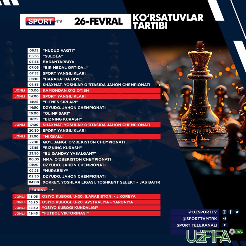 Sport va Futbol telekanallarida 26-fevral kuni 2 ta jonli translyasiyalar bor