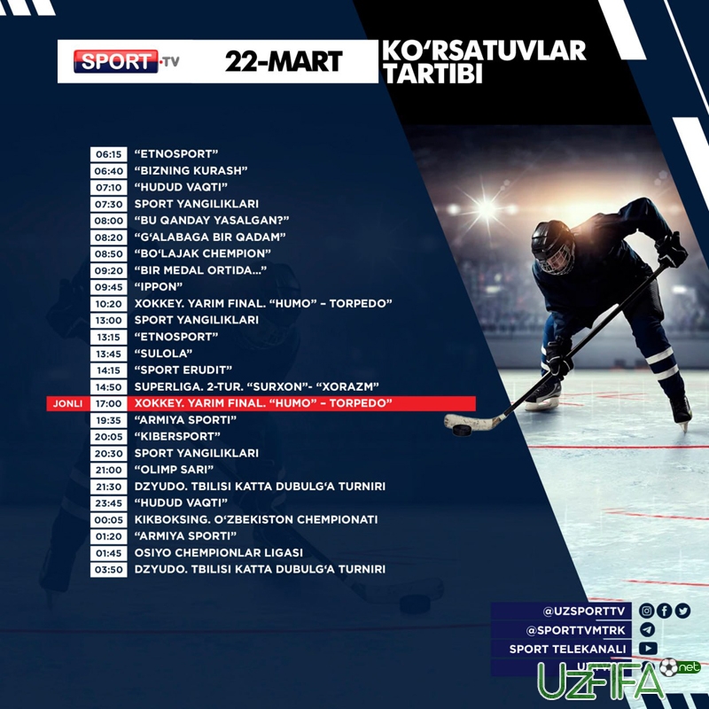 Sport telekanalida 22-mart kuni jonli xokkey translyasiyasi bor