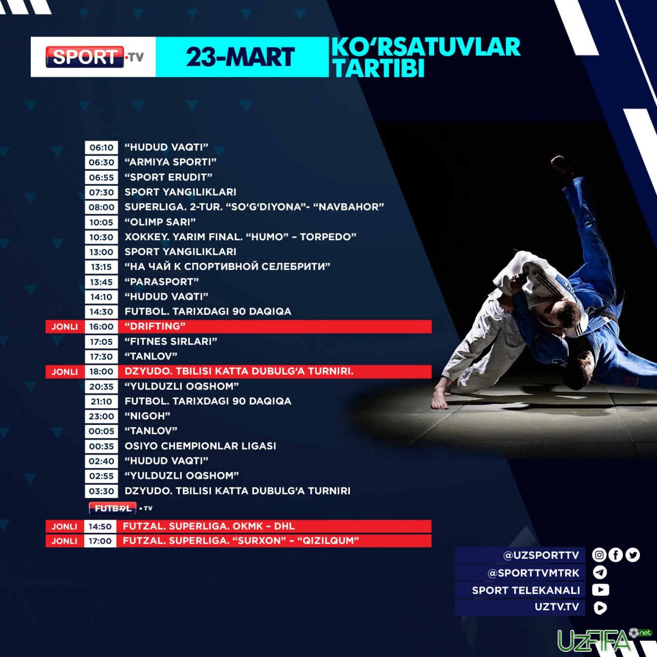 Sport va Futbol telekanallarining 23-mart kungi ko‘rsatuvlar dasturi