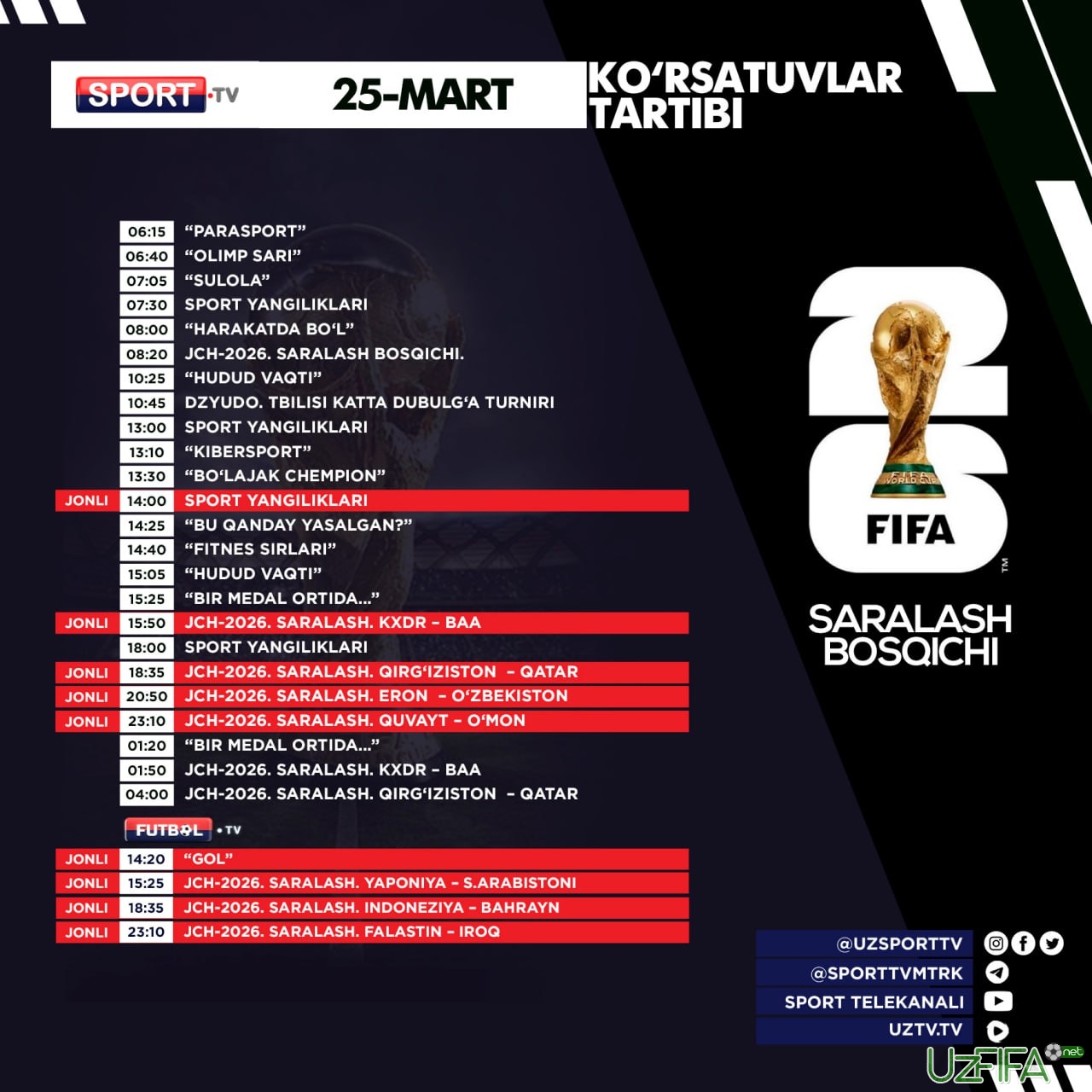 Sport va Futbol telekanallarining 25-mart kungi ko‘rsatuvlar dasturi. Bugun JCH saralashining 7 ta o‘yini jonli namoyish etiladi