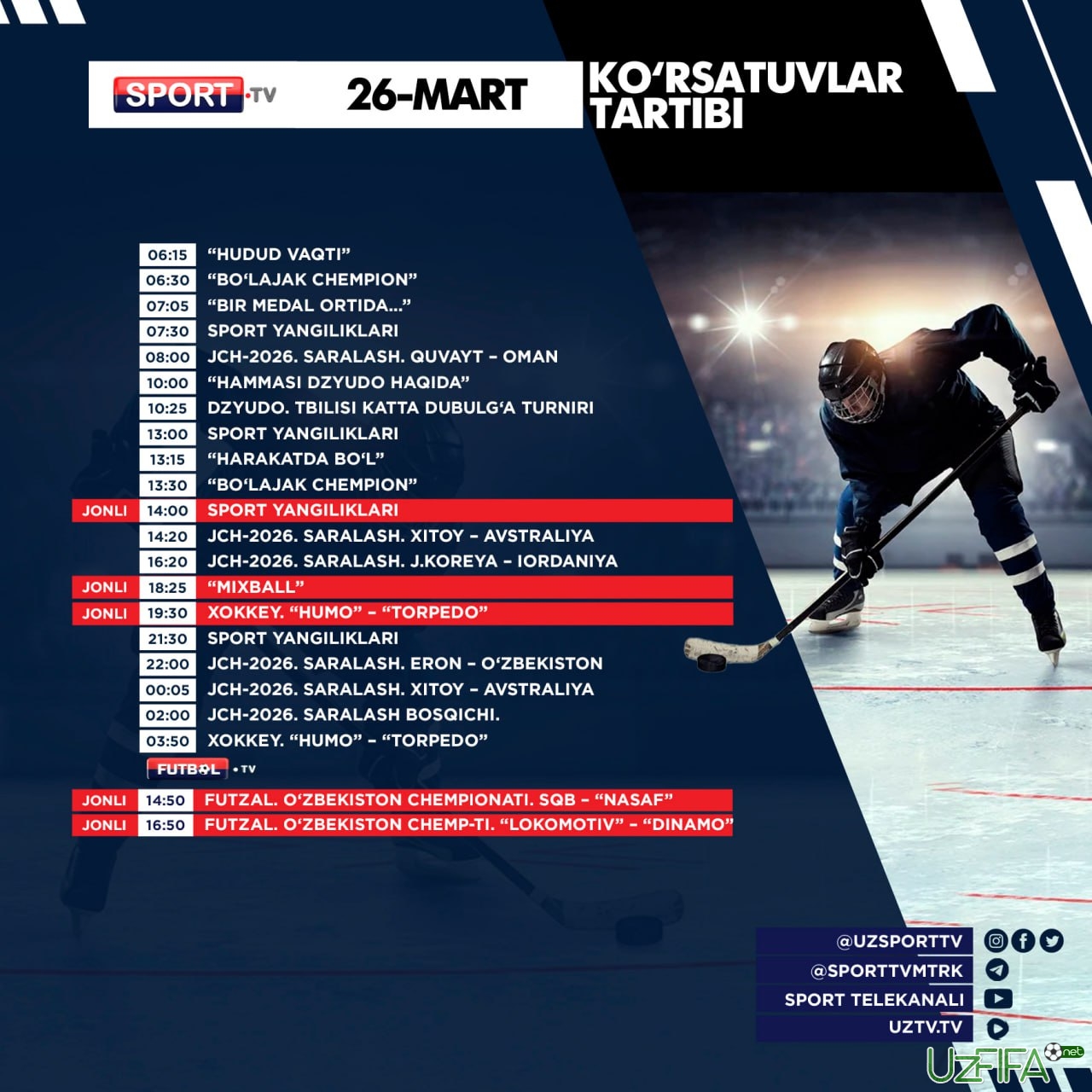 Sport va Futbol telekanallarining 26-mart kungi ko‘rsatuvlar dasturi