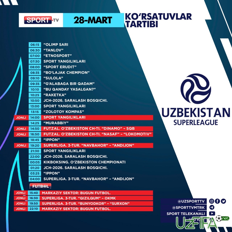 Sport va Futbol telekanallarida 28-mart kuni Superliga va futzal o‘yinlaridan jonli translyasiyalar bor
