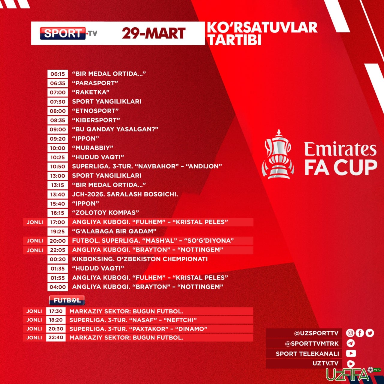 Sport va Futbol telekanallarining 29-mart kungi ko‘rsatuvlar dasturi. Bugun Superliga va Angliya kubogining jami 5 ta o‘yini jonli efirda ko‘rsatiladi