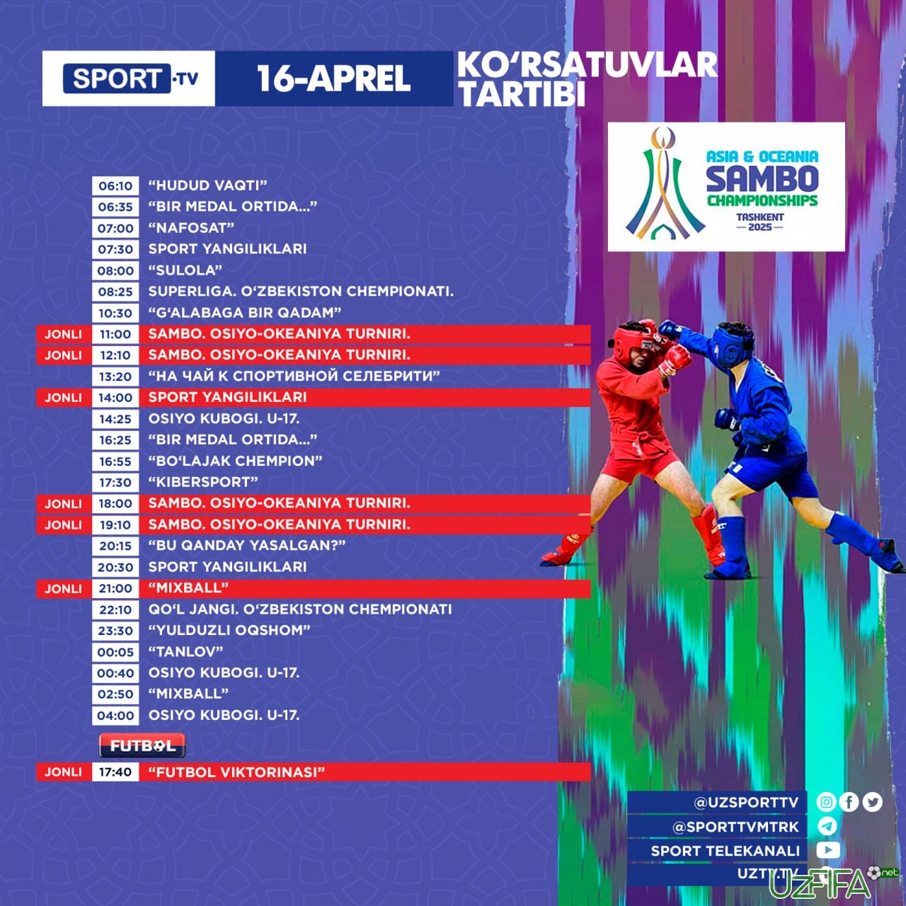 Sport va Futbol telekanallarining 16 aprel kungi ko‘rsatuvlar dasturi