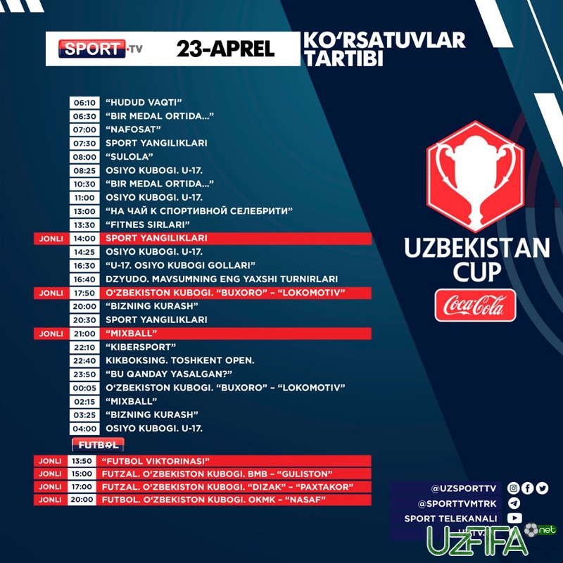 Sport va Futbol telekanallarida 23-aprel kuni bir nechta futbol va futzal translyasiyalari bor