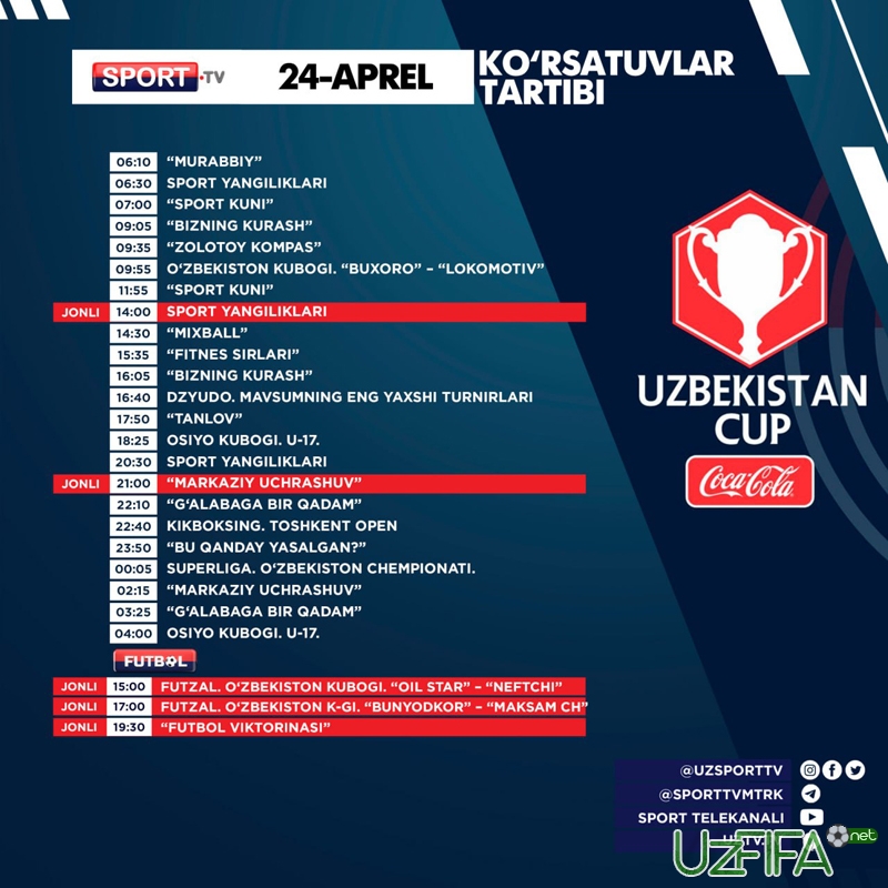Sport va Futbol telekanallarida 24-aprel kuni 2 ta futzal translyasiyasi bor
