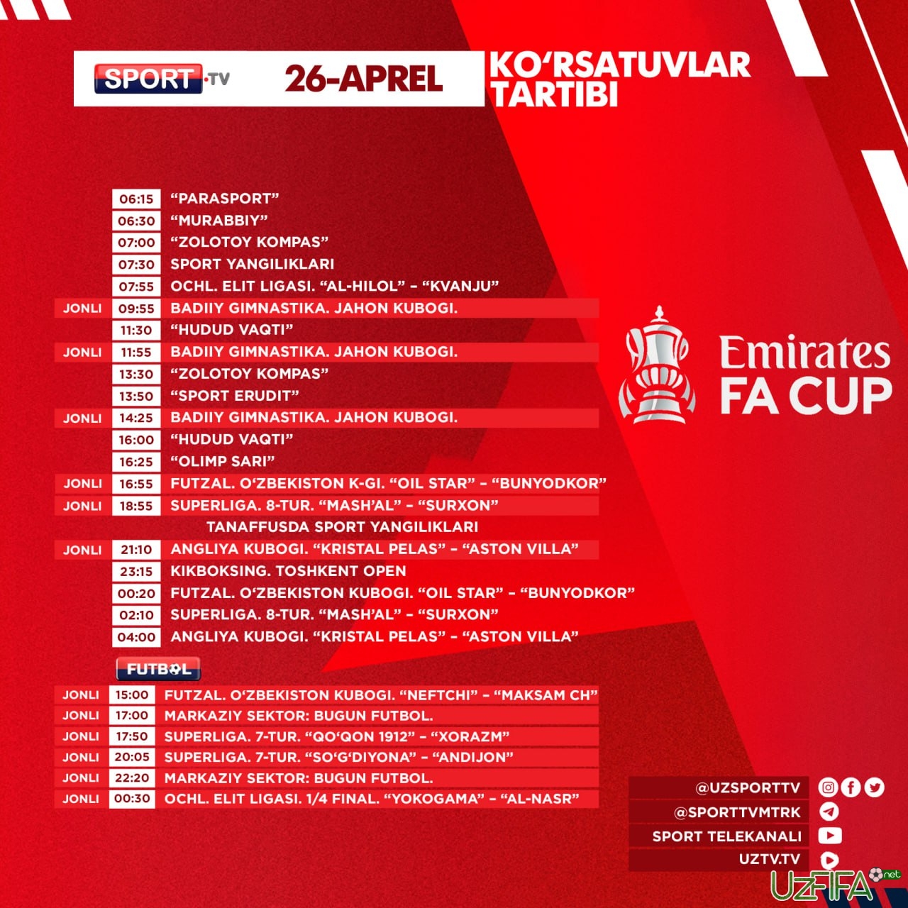 Sport va Futbol telekanallarida 26-aprel kuni ko‘plab futbol va futzal translyasiyalari bor