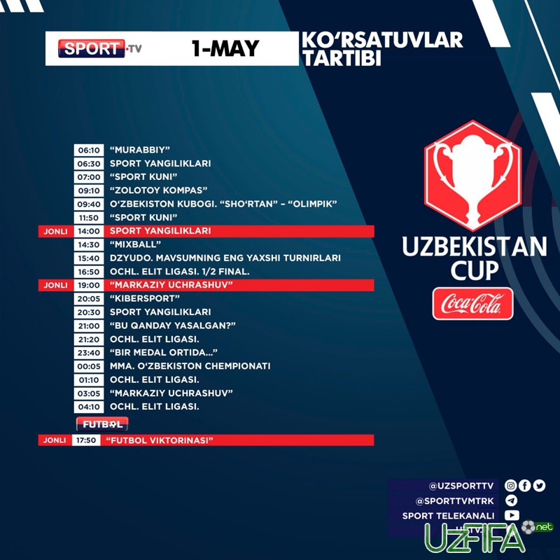 Sport va Futbol telekanallarining 1-may kungi ko‘rsatuvlar dasturi