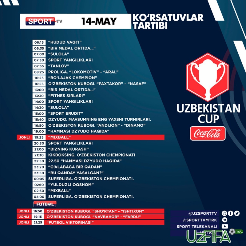 Sport va Futbol telekanallarida 14-may kuni 2 ta futbol translyasiyasi bor