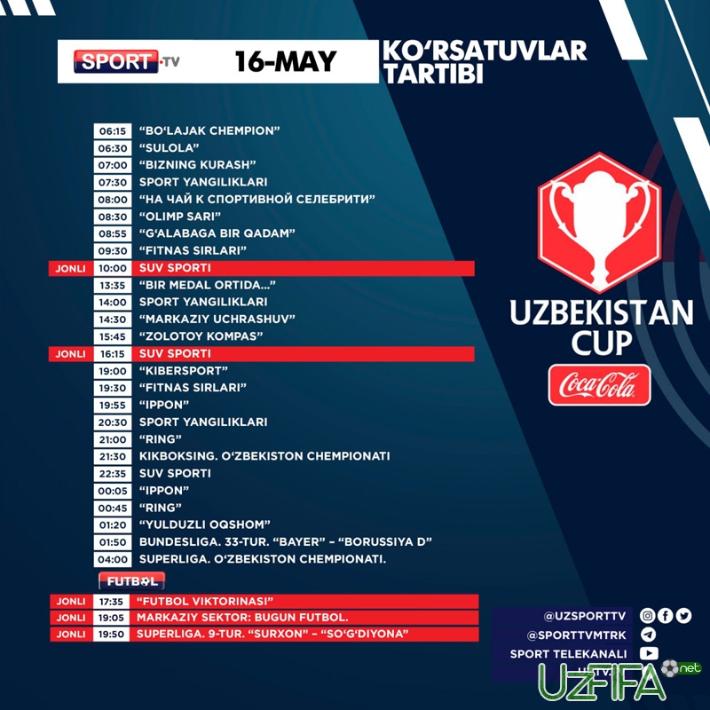 Sport va Futbol telekanallarida 16-may kuni 1 ta futbol translyasiyasi bor
