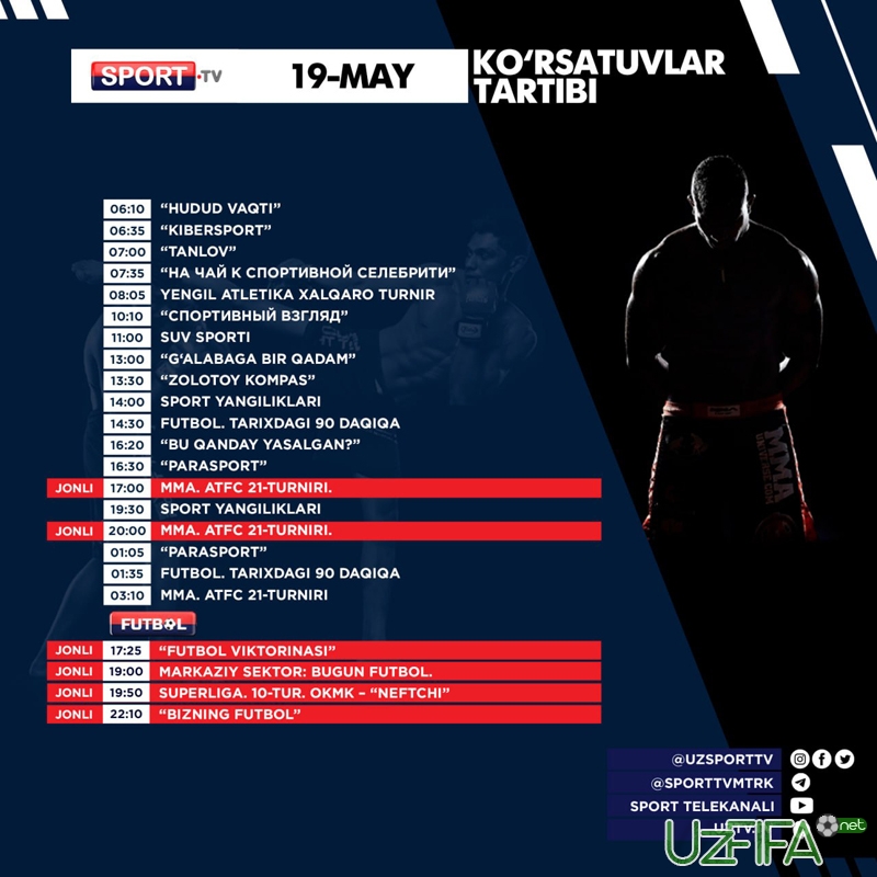 Sport va Futbol telekanallarida 19-may kuni 1 ta futbol translyasiyasi bor