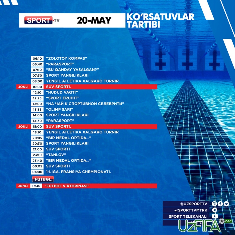 Sport va Futbol telekanallarining 20-may kungi ko‘rsatuvlar dasturi
