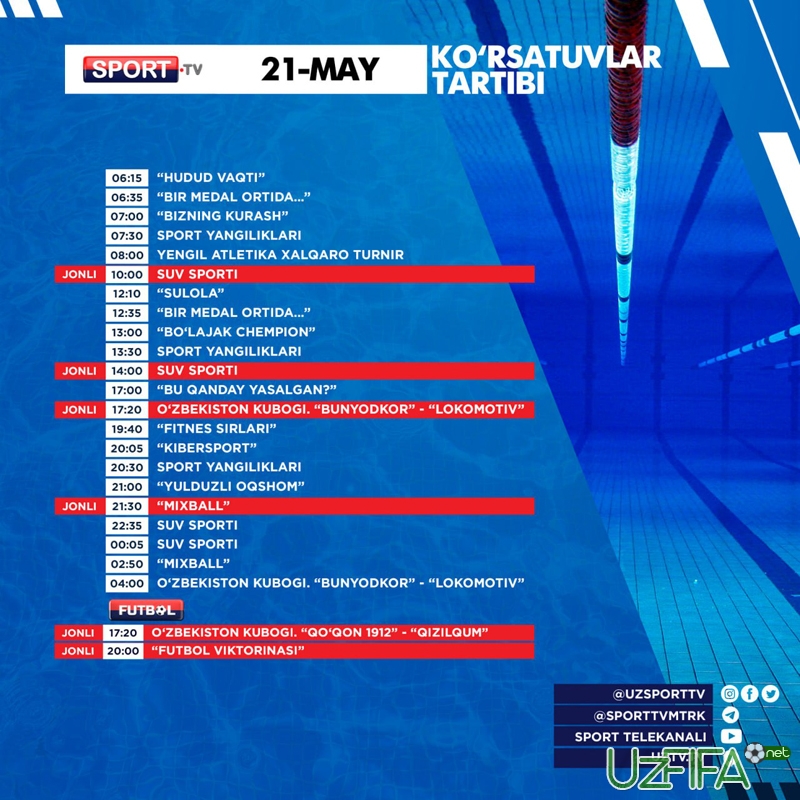 Sport va Futbol telekanallarida 20-may kuni 2 ta futbol translyasiyasi bor