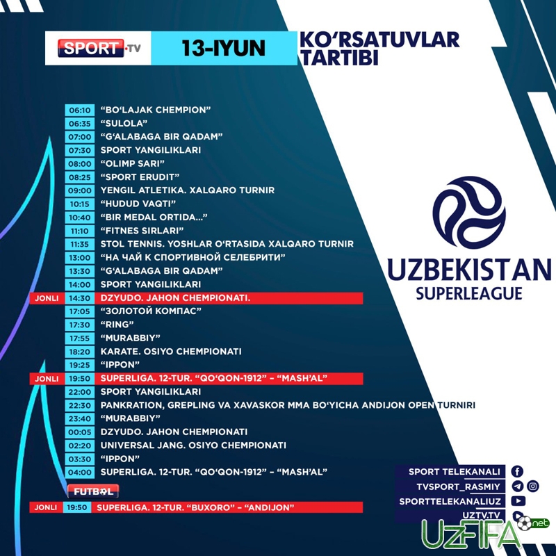 Sport va Futbol telekanallarida 13-iyun kuni 2 ta futbol translyasiyasi bor