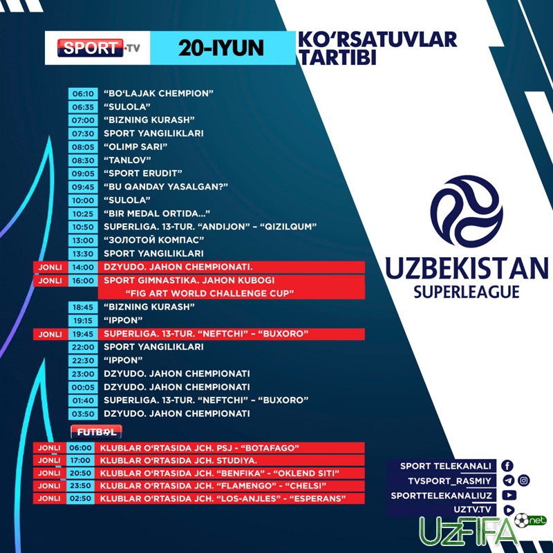 Sport va Futbol telekanallarida 20-iyun kuni 5 ta futbol translyasiyasi bor