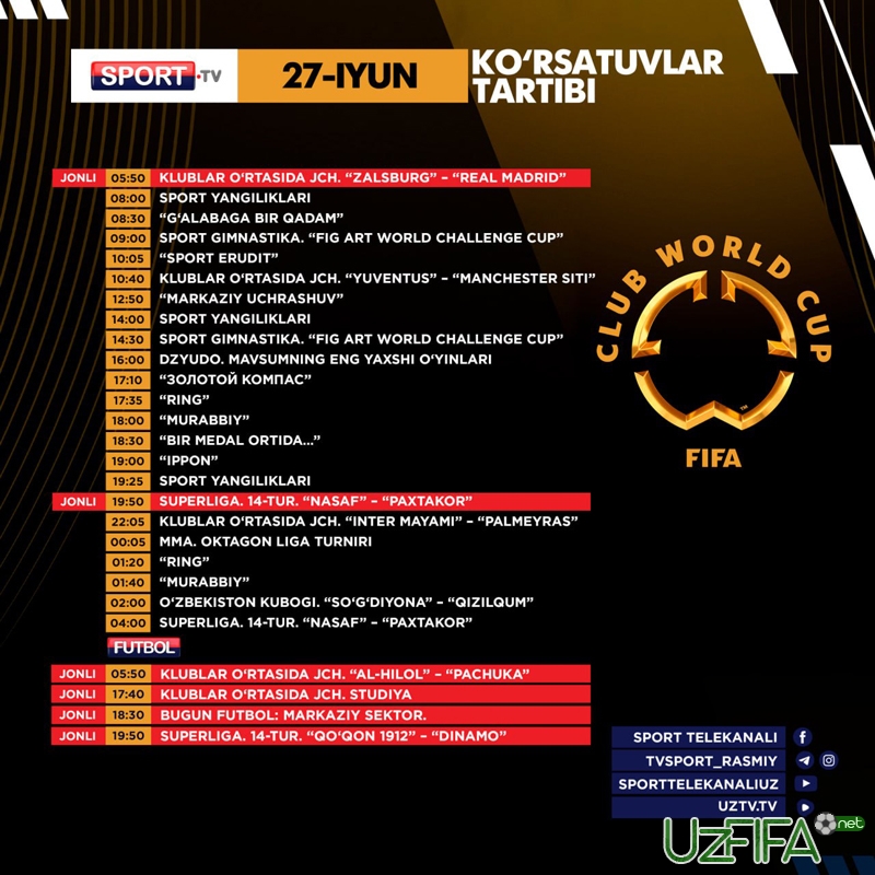 Sport va Futbol telekanallarida 27-iyun kuni Superliganing markaziy o‘yinlari translyasiyasi bor