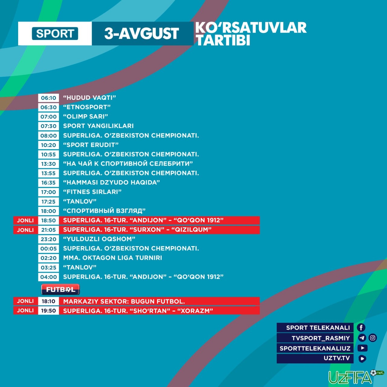 Sport va Futbol telekanallarida 3-avgust kuni 3 ta futbol translyasiyasi bor