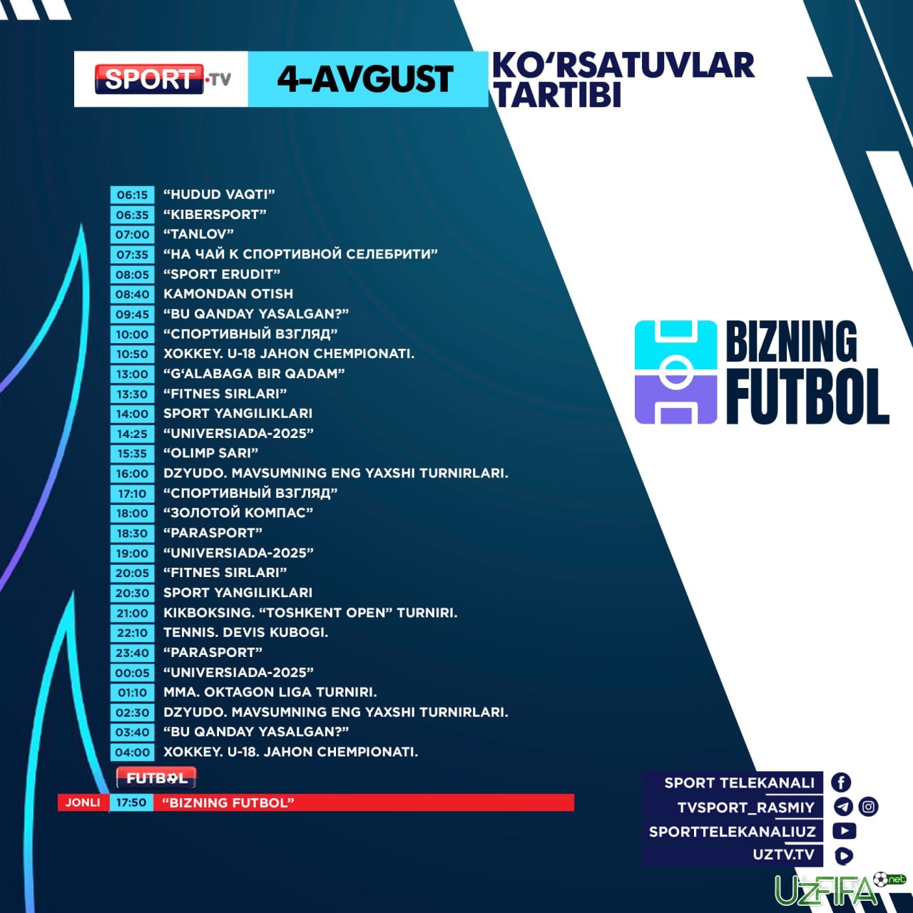 Sport va Futbol telekanallarining 4-avgust kungi ko‘rsatuvlar dasturi
