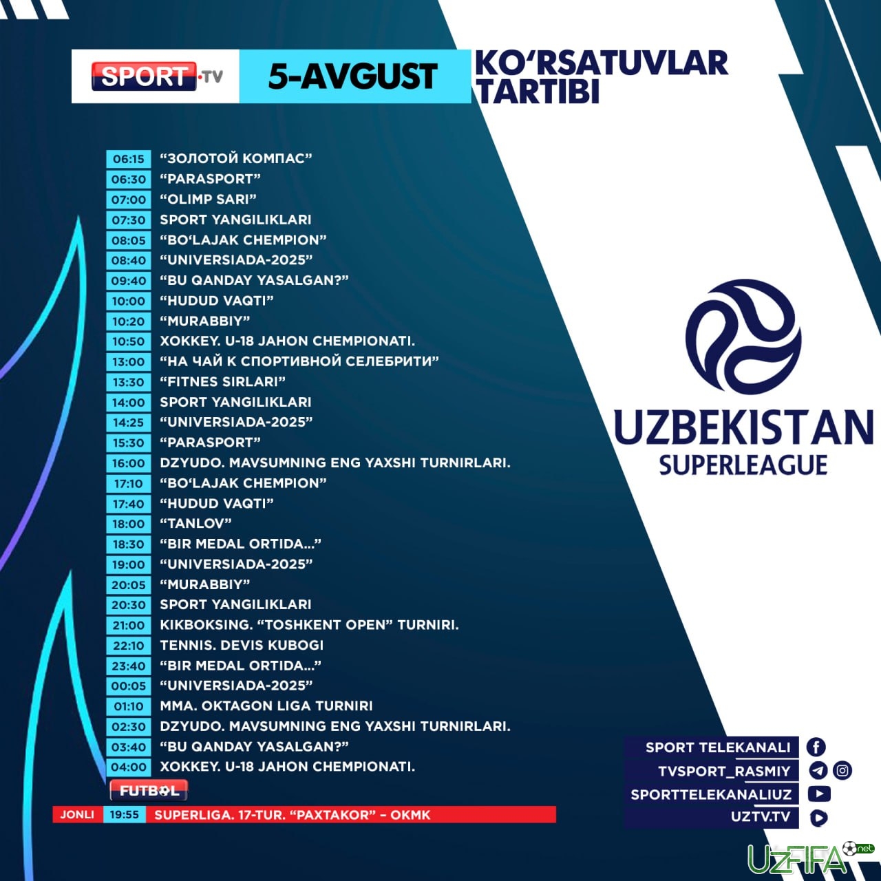 Sport va Futbol telekanallarida 5-avgust kuni 1 ta futbol translyasiyasi bor