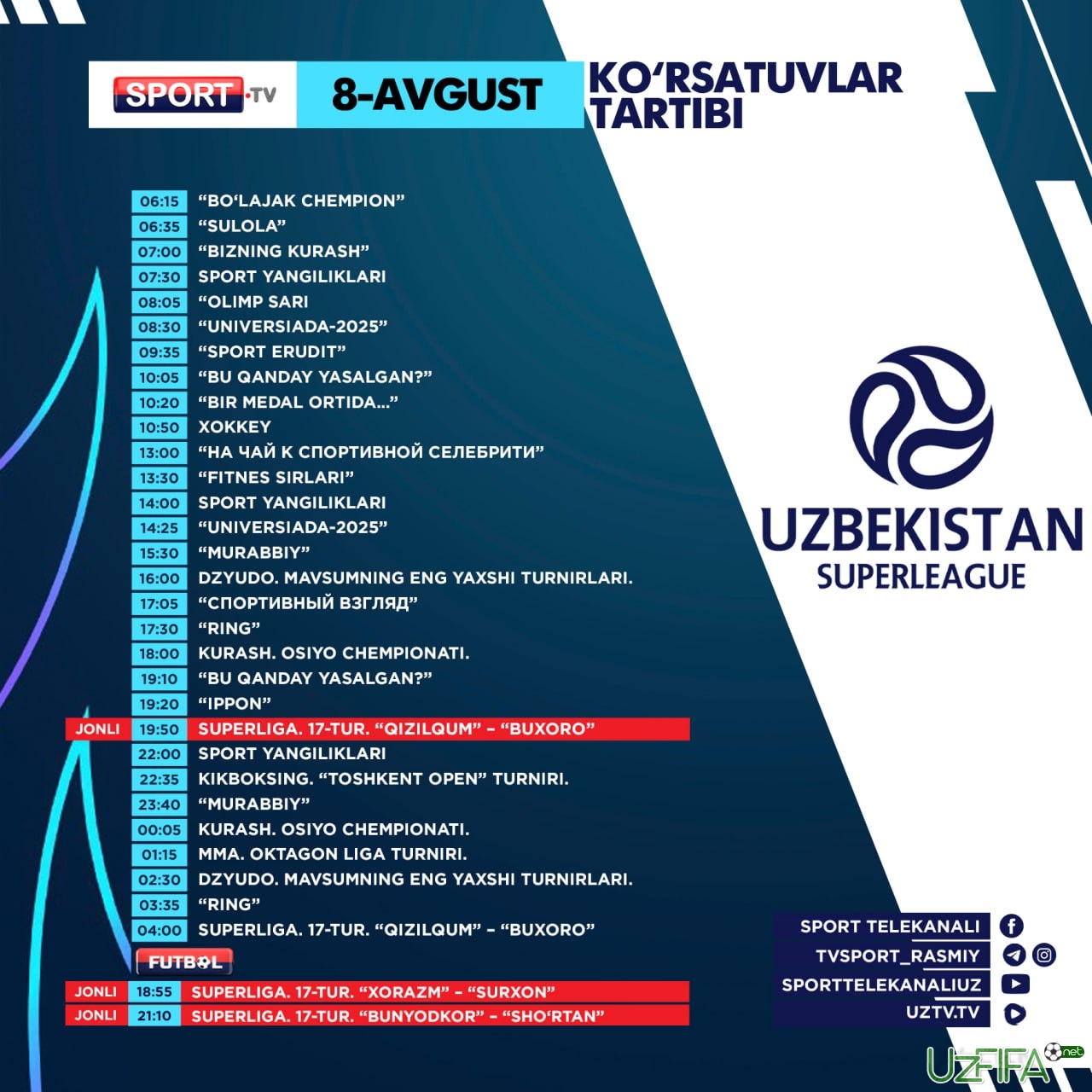 Sport va Futbol telekanallarida 8-avgust kuni 3 ta futbol translyasiyasi bor