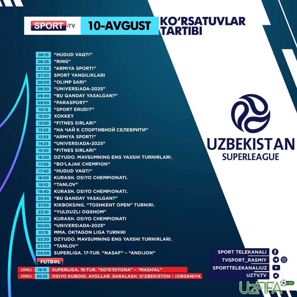 Sport va Futbol telekanallarida 10-avgust kuni 2 ta futbol translyasiyasi bor