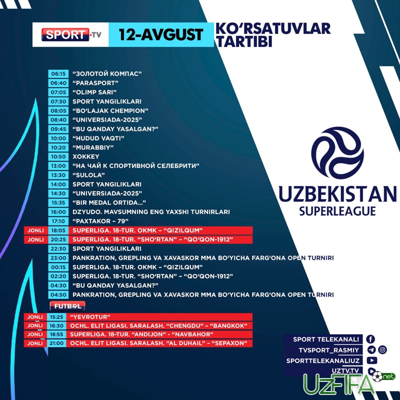 Sport va Futbol telekanallarida 12-avgust kuni 5 ta futbol translyasiyasi bor