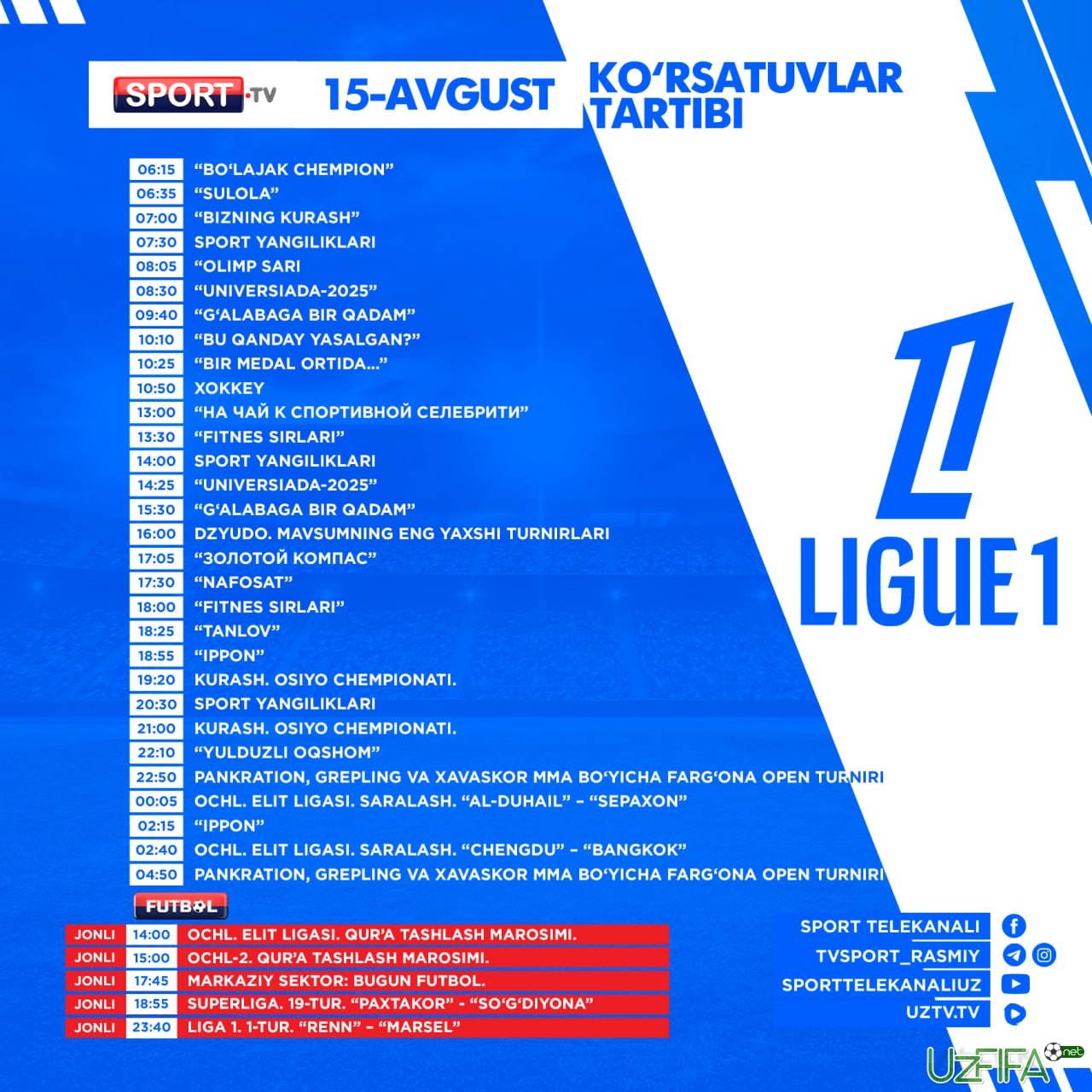 Sport va Futbol telekanallarida 15-avgust kuni 2 ta futbol va OCHL qur’asi translyasiyalari bor