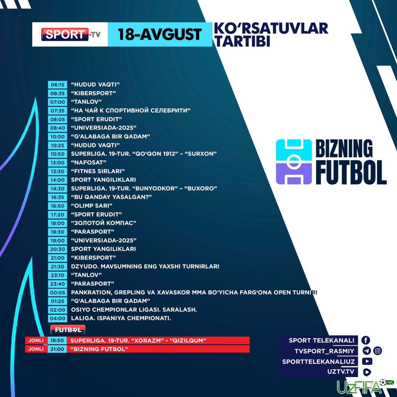 Sport va Futbol telekanallarida 18-avgust kuni 1 ta futbol translyasiyasi bor